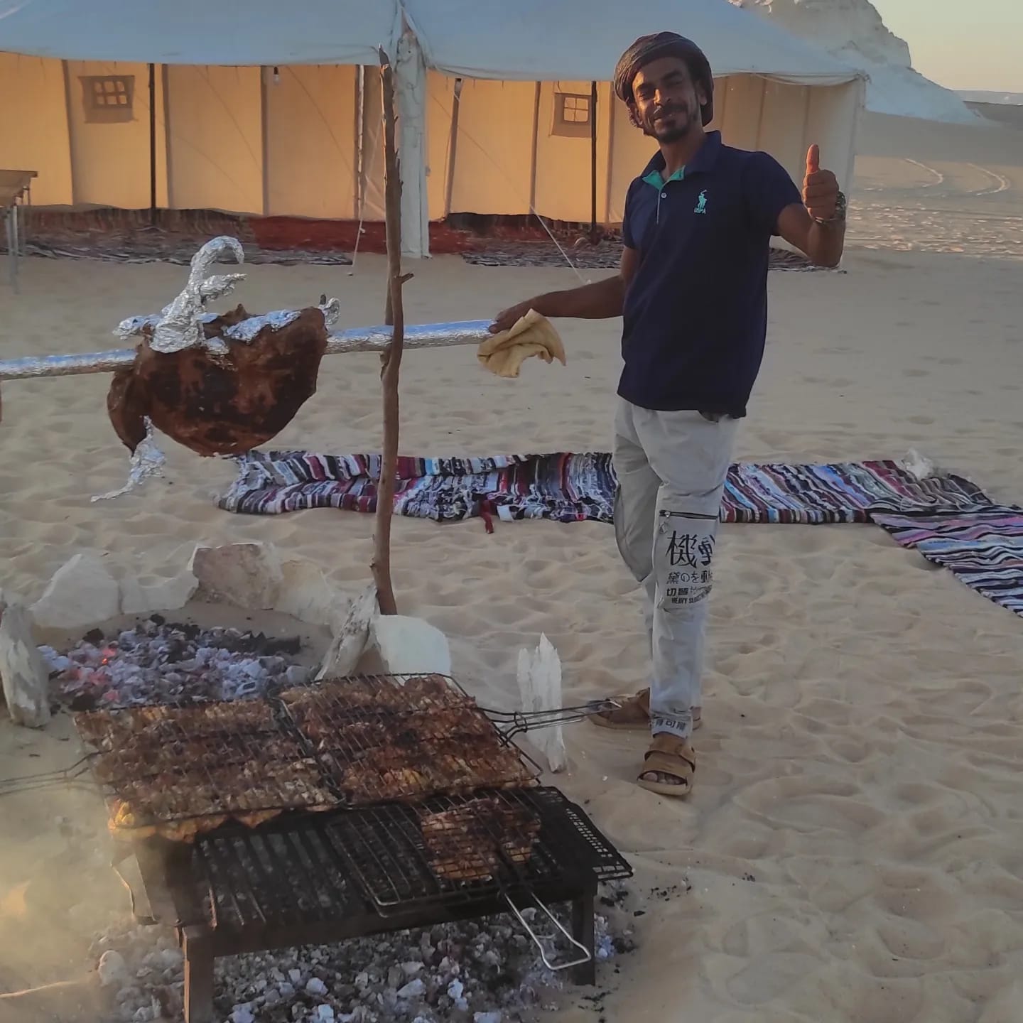 after having our breakfast we can walk littil around till our jeep be redy for us to start driving and resume exploring the best around white desert , we cross the valleys area and we see in our way the palm trees around and we visit the old water melon farms then we arrive to the green spring to have our lunch then we drive to visit Old Santa tree and the old white desert and tents area then the new white desert with all the lovely formations of the limestone then we find a nice spot to make our camp to have dinner and tea around the fire then spending the night under the stars.
