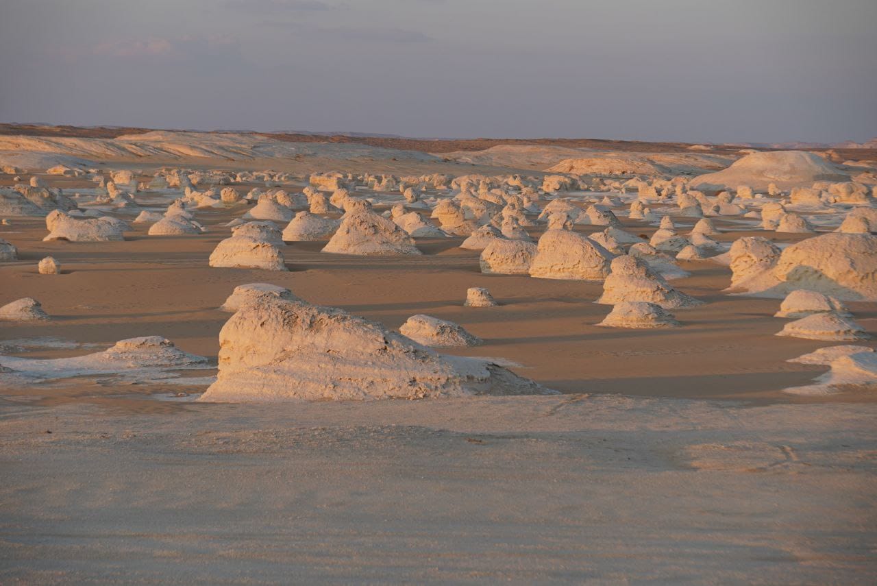 after breakfast we drive to visit the new white desert, in the way we stop to collect the flower stones then arriving to the new white desert we visit the best spots then we drive to have lunch at the green spring after lunch we drive to visit the old white desert, then drive back to spend the night at the new white desert, dinner and spending the night under the stars.